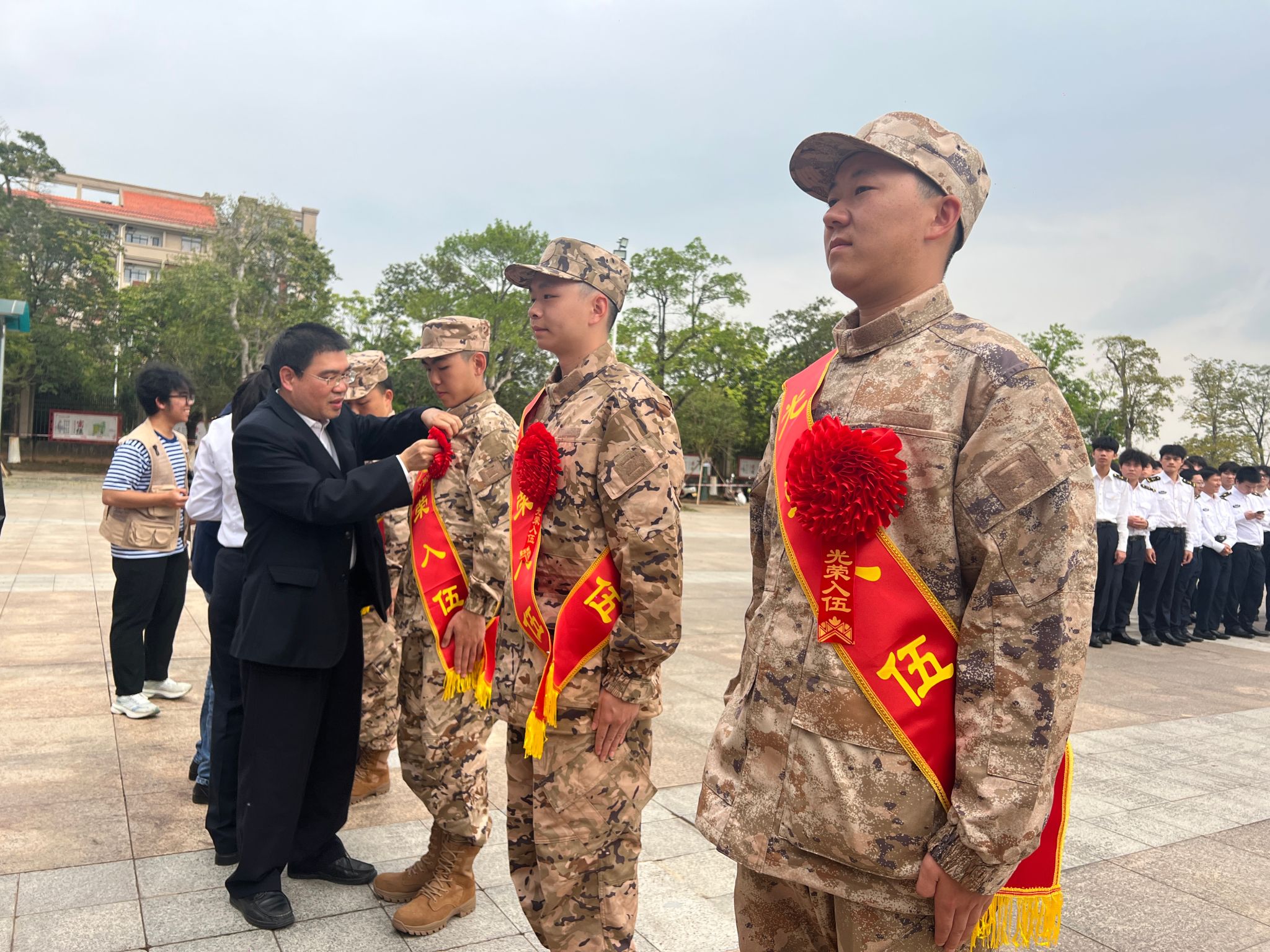 参加欢送仪式的党委武装部领导和学院老师为入伍学生佩戴“光荣入伍”绶带和大红花。