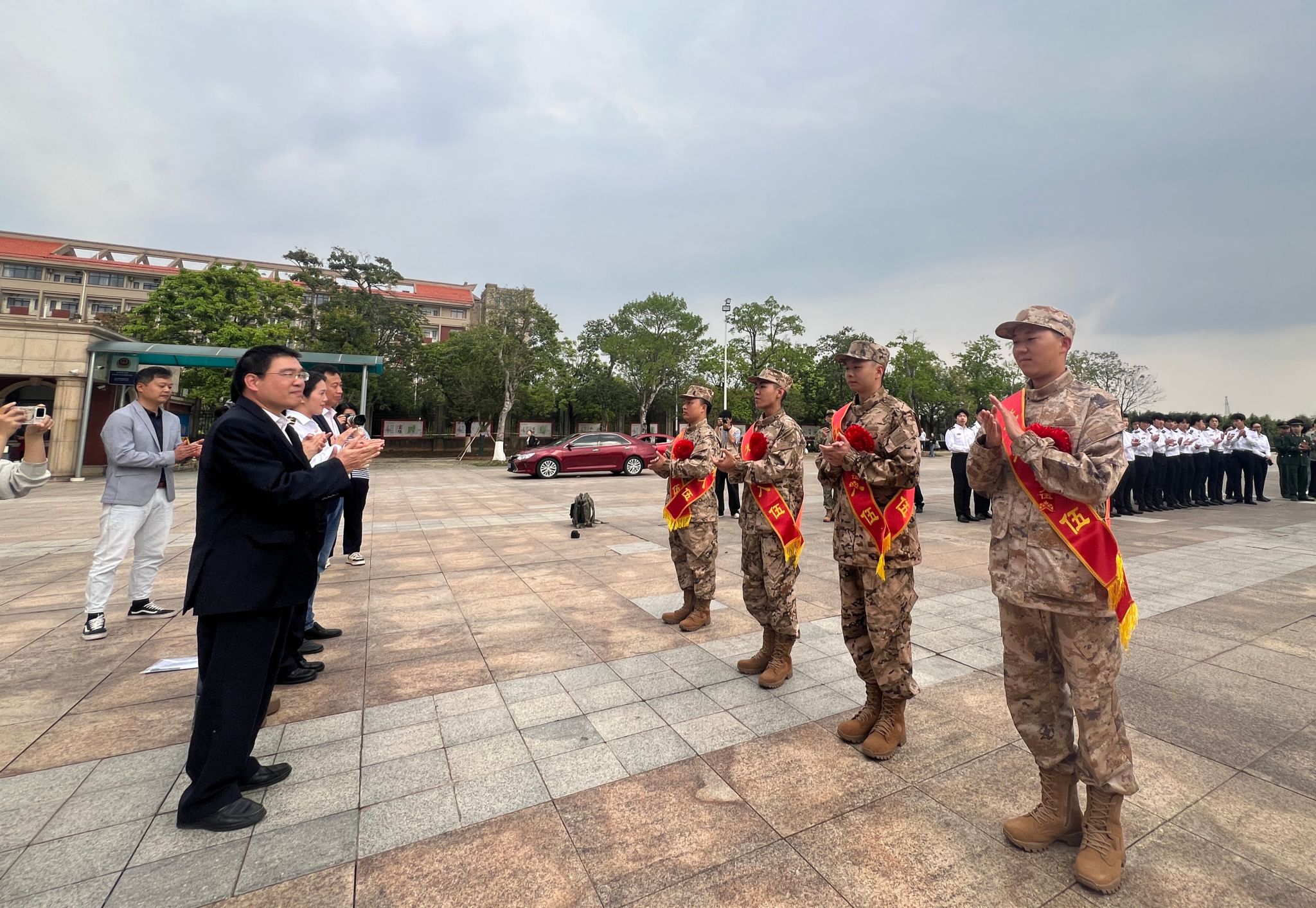 现场师生满怀不舍与牵挂,挥手送别入伍学子。
