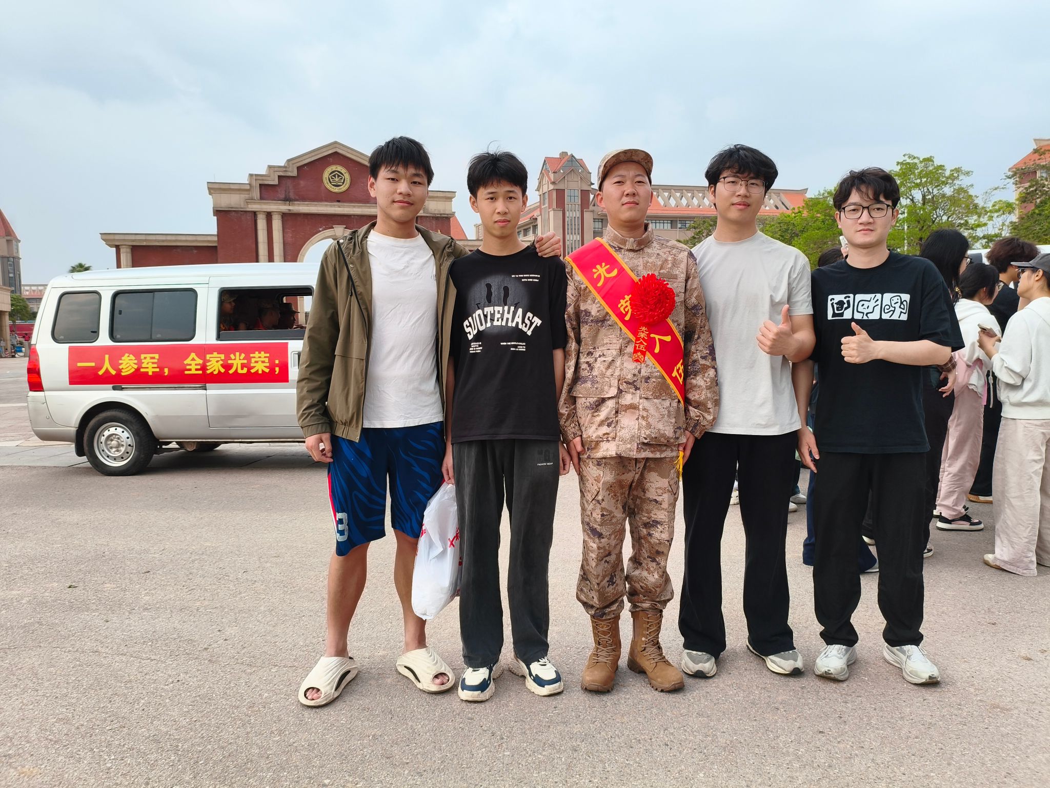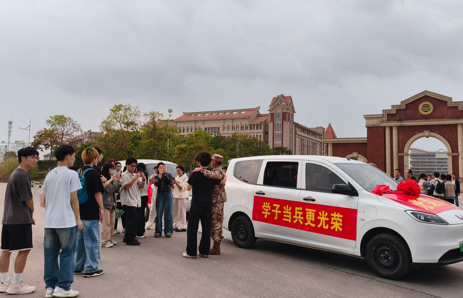 入伍学生与老师、同学们话别并合影留念。