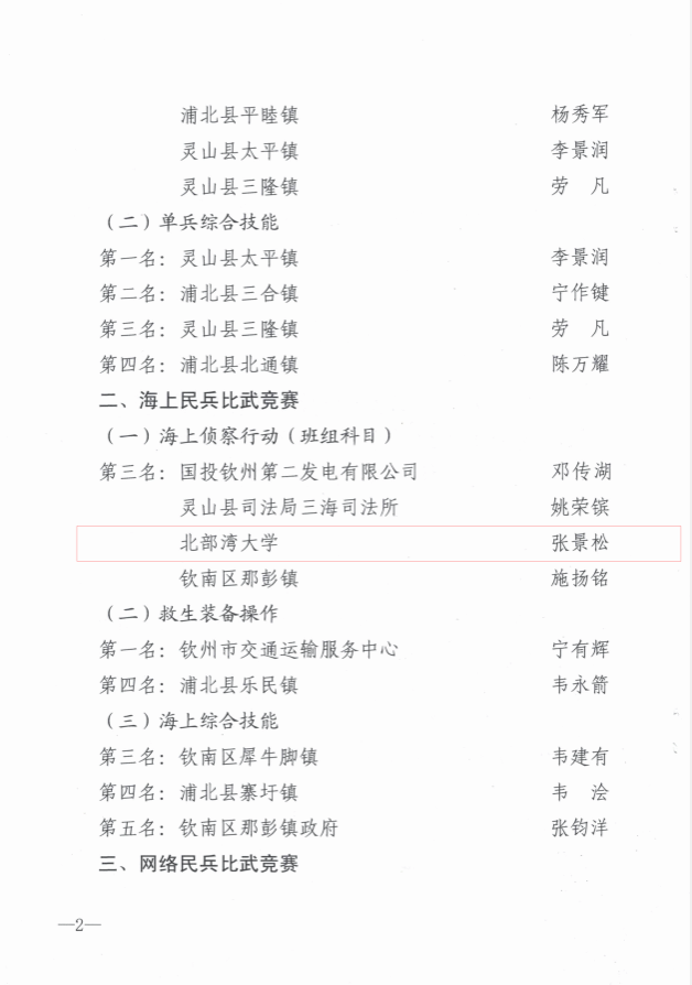 近日,据广西军区通报表彰,我校资源与环境学院地理本201班张景松同学通过钦州市基干民兵训练尖子遴选脱颖而出,代表钦州军分区参加广西军区群众性练兵比武获海上侦察行动比武竞赛第三名。