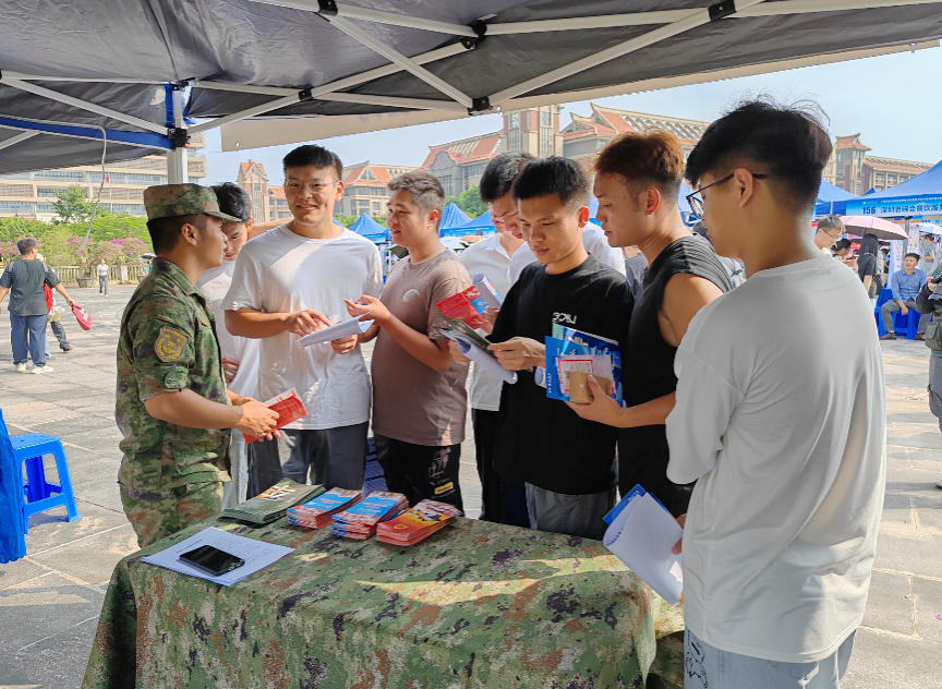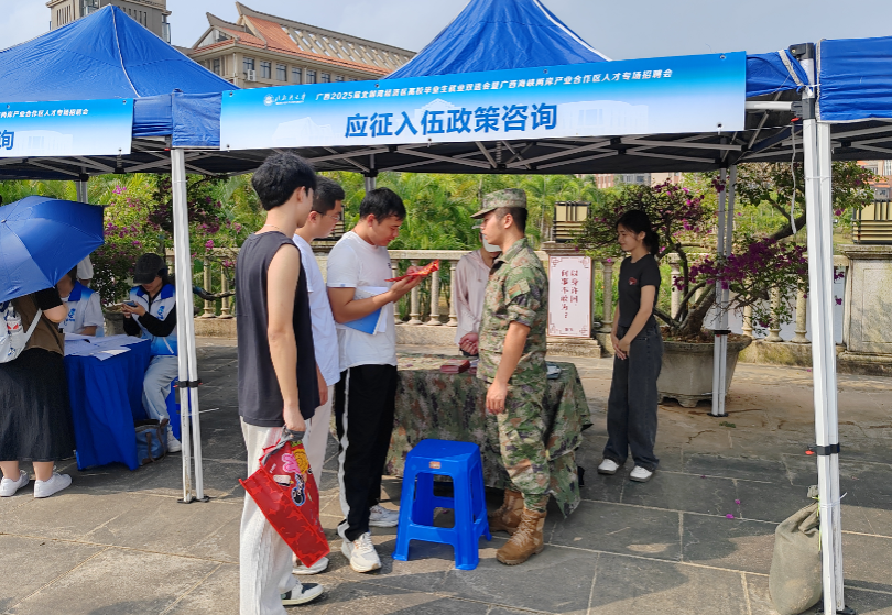 10月12日上午,我校在中央广场举行广西2025届北部湾经济区高校毕业生就业双选会,学校武装部、大学生国防军事教育协会利用双选会设置了应征入伍政策咨询站,为2025届毕业生发放征兵宣传资料,宣讲征兵政策。