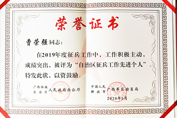 近日,从《广西壮族自治区人民政府办公厅 中国人民解放军广西军区动员局关于表彰2019年征兵工作先进单位和先进个人的通报》(桂政办发〔2020〕31号)获悉,学校武装部国防教育科(军训管理科)科长曹荣强被评为“自治区征兵工作先进个人”。