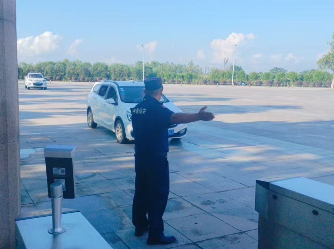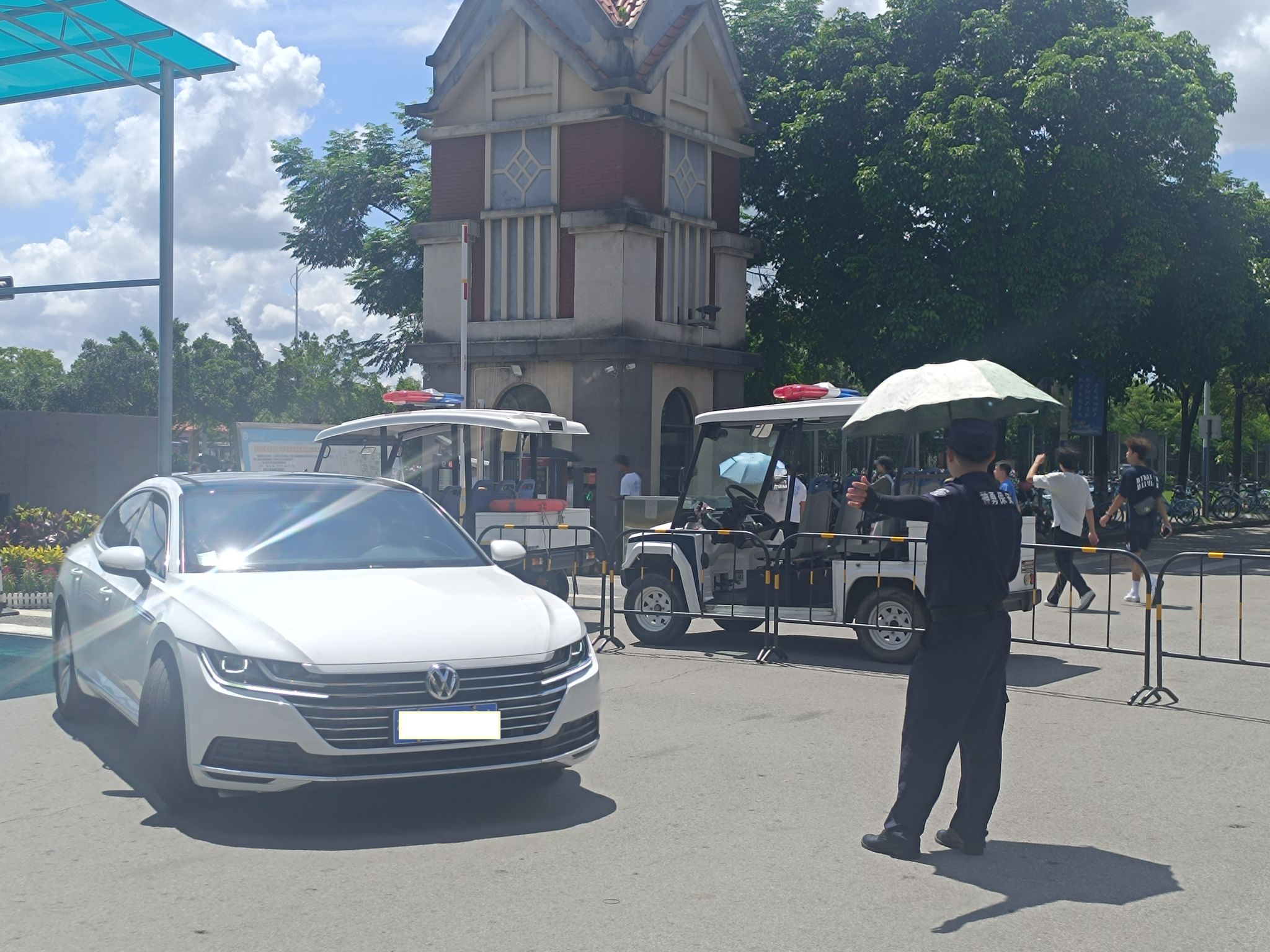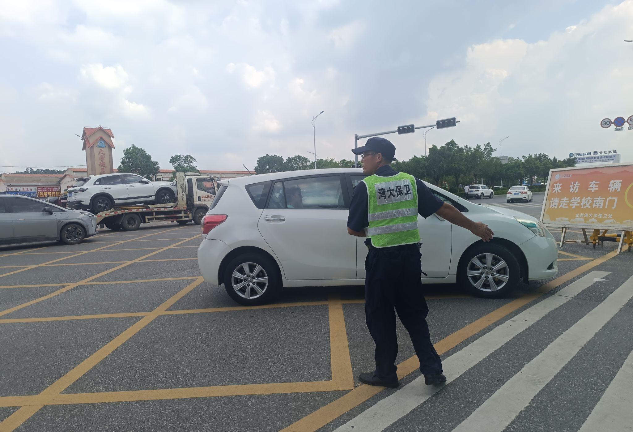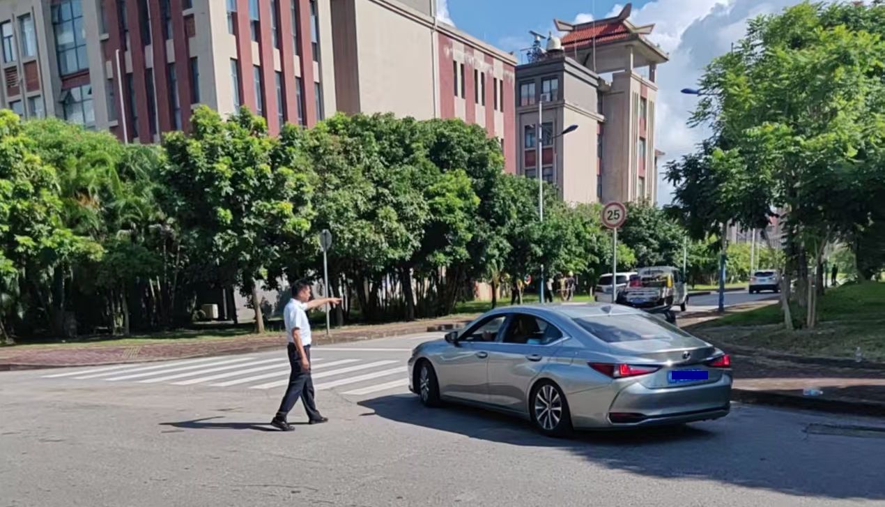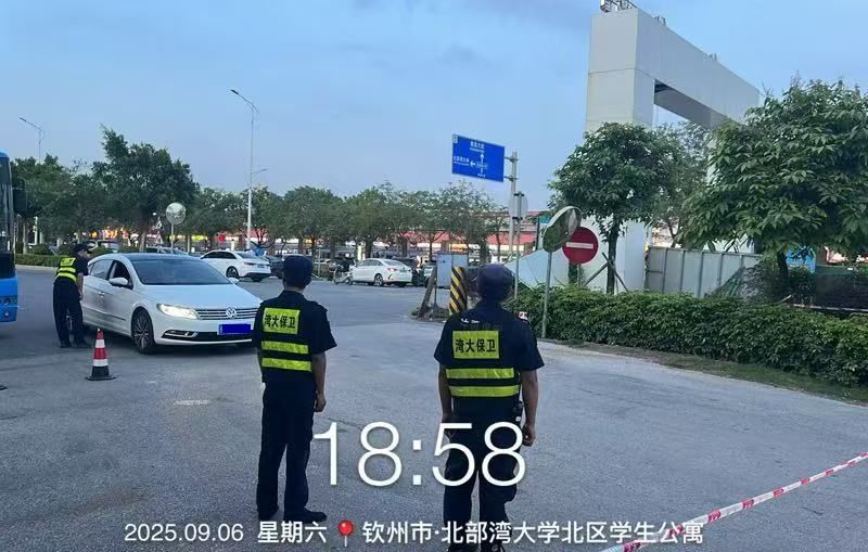 全方位守护并非只聚焦报到当日,而是贯穿“前期筹备-报到高峰-收尾保障全过程。早在新生报到前两周,保卫处便启动准备工作:结合往年报到数据与今年新生规模,预判今年人流、车流高峰时段与重点区域,制定《北部湾大学迎接2025级新生报到校园安保交通工作方案及应急预案》,明确人员分工与应急处置流程;安保团队提前对校园内各主要通道、报到点、宿舍区等重点区域进行安全隐患排查,对监控设备、消防设施进行全面检修,确保各类安防设备正常运行;合理规划校园交通路线,在校园入口、主干道、交叉路口等地设置临时交通指引牌50余块,启用了东区篮球场作为新生家长车辆临时停放区域。