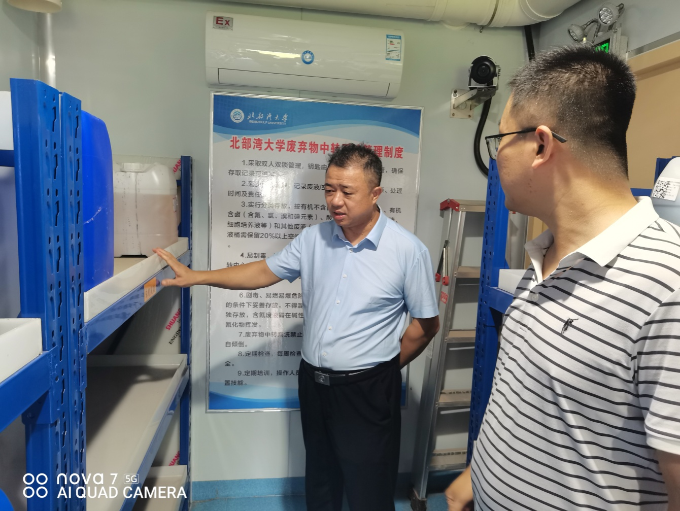 在学校实验室危险废弃物中转系统仓库,他指出要进一步加强危险废弃物的转运管理,提高废弃物的处理效率;要完善废弃物中转系统仓库与相关二级学院的危险废弃物交接管理制度,实现安全运行。