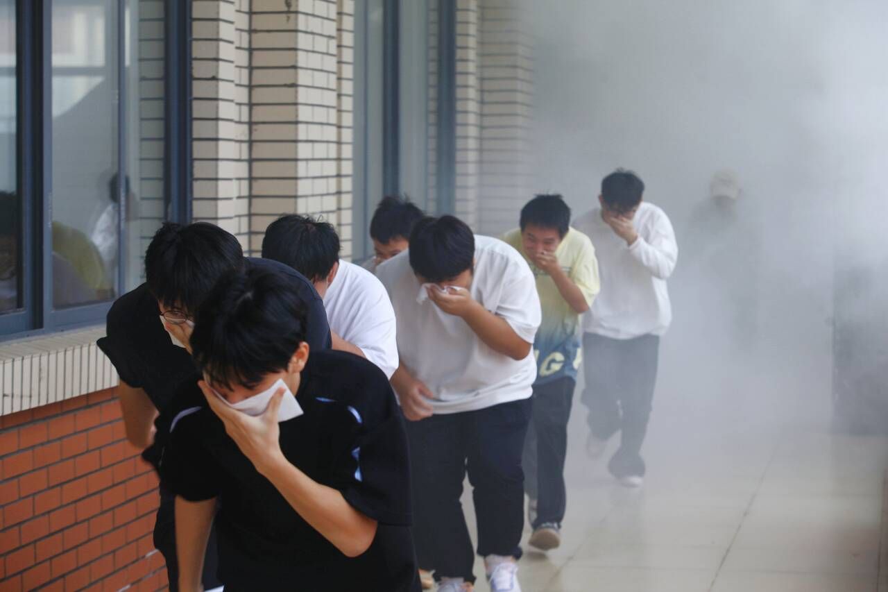 实验室内师生迅速拿起就近的灭火器尝试初期扑救,在火势无法控制的情况下,按照预定路线,弯腰低姿、用湿毛巾捂住口鼻,从右侧楼道快速有序撤离。疏散引导组工作人员全程值守楼道关键节点,耐心指引方向,及时扶助一名“崴脚跌倒”的学生,重点护送行动不便者撤离,确保无人员滞留。